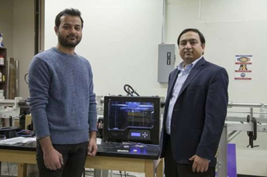 机械和航空航天工程学副教授Nikhil Gupta(右)的博士生Ashish Kumar Singh(左)报告了复合泡沫塑料细丝的研究进展和利用商用打印机进行3D打印的相关工艺。图片来源:纽约大学工学院