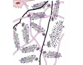 来自美国波士顿大学的研究人员尝试用合成的高分子材料修复受损的关节软骨。他们选择了两种亲水性良好的聚合物单体,将关节软骨浸泡在含有这两种单体以及光引发剂的溶液中。一段时间后,聚合物单体和光引发剂渗透进软骨中。随后他们再用特定波长的光照射软骨,光照使得光引发剂引发两种单体的聚合,形成一个能够高度吸水的聚合物网状结构,即通常所说的水凝胶。这个水凝胶穿插在原有的糖胺聚糖的网络中,对后者起到了支撑作用。
