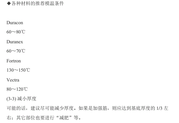 (4)对薄件应提高温度,保证料流畅顺,对厚壁制件应降低模温。