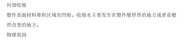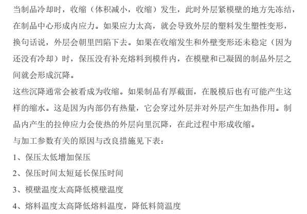 结晶性的塑料比非结晶性塑料收缩历害,加工时要适当增加料量,或在塑料中加成换剂,以加快结晶,减少收缩凹陷。