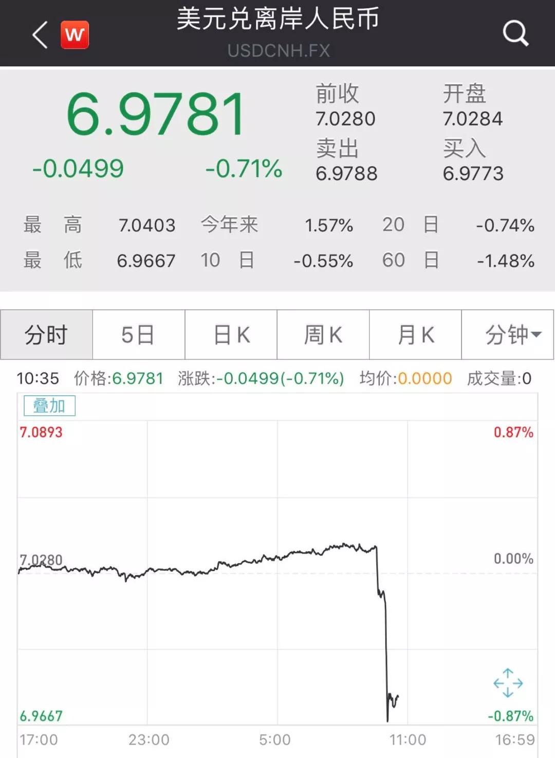 同时,离岸人民币汇率方面,直接收复7.0关口重回6时代,盘中一下子涨了600多点。