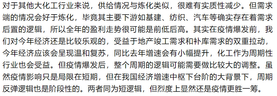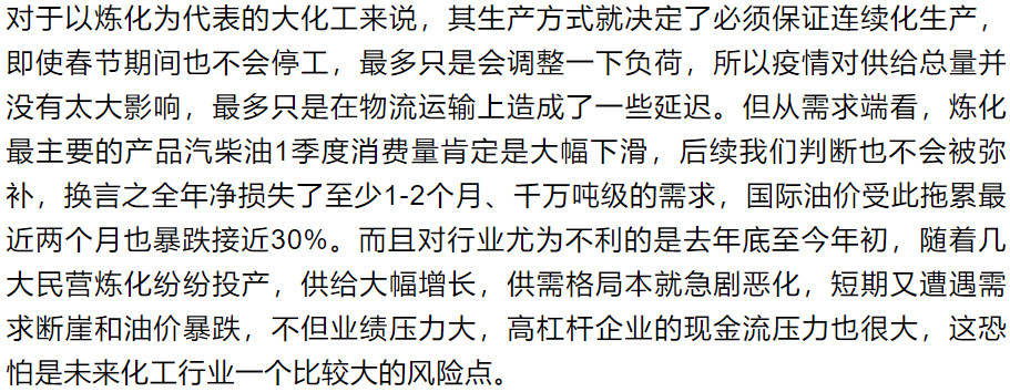随着疫情初步得到控制,近期各行业都将迎来全面复工,此时也有必要审视一下疫情到底对今年化工行业景气有多大影响。所有周期分析本质上都是供需分析,由于大化工必须连续化生产的特点,在疫情期间也不会停工,除湖北和部分精细化工企业外,整体行业供给受影响并不大。而需求端则普遍面临更下游的延迟复工,受负面影响很大,节后很可能会因为库存压力出现大面积的降价促销,一季度化工业绩肯定是很差的,这应该也是市场的共识。对后续需求虽然市场普遍认为更多的只是后置而已,长期影响并不大,但仅就今年而言有些需求确实是被消灭掉了,后续也很难再弥补,如成品油;有些如建筑、纺织等看似有需求后置逻辑,但相比疫情前应该还是会有下滑。就我们判断,炼化行业应该是确定性受损,其他大化工行业的周期性机会可能也要等到下半年超额库存被消化之后,部分疫情期间停产的精细化工行业可能会受益于供给实质性减少叠加需求后置带来的供需错配和由此引发的价格上涨,整体而言疫情对化工企业全年业绩的综合影响应该还是弊大于利。对于不同行业受到的具体影响,我们判断如下: