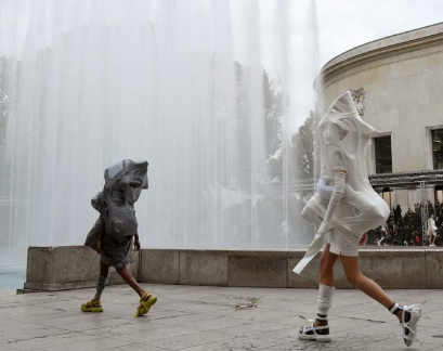 瑞克欧文斯(Rick Owens)的时尚秀,地址坐落于法国巴黎日本东京宫(Palais de Tokyo),时装秀的观众们穿上当场派发的雨披。伴随着音乐喷泉水花四溅,模特亮相,衣着浮夸小号的服装,逐层面料包囊,被描述为“外星球一样茧”。